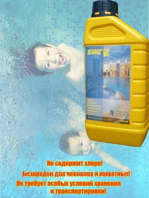 Ось вже довгий час основним продуктом для знезараження води всіх видів басейнів, згідно світовим стандартам, є хлор та хлорвмісні препарати. Безсумнівно, ефективні, однак далеко не ідеальні засоби, особливо з урахуванням їх негативного впливу на людський організм. Як відомо, до 1% внесеного хлору, вступаючи в реакцію з органікою, що знаходиться у воді, утворює небезпечні канцерогенні сполуки, що викликають алергії, подразнення шкіри і очей. Нещодавнє дослідження бельгійських вчених встановило, що леткі продукти взаємодії хлору з потом, що утворюються в басейнах, дуже шкідливі для легенів. У постійних відвідувачів — дітей і дорослих — були виміряні рівні певних білків у крові, службовців показником пошкодження легеневої тканини. Згідно з отриманими результатами, частота відвідування басейну безпосередньо пов'язана з рівнем цих білків. Причому у дітей, які регулярно відвідують басейн, результати аналізів були такими ж, як у завзятих курців. Підвищена концентрація цих білків була також виявлена у людей, які довгий час знаходяться біля води, але не плавали в басейні. Тому вже давно вчені всього світу з перемінним успіхом шукають можливості знайти безпечну заміну хлору та хлоровмісних препаратів для знезараження води, в тому числі і води плавальних басейнів. Тут ми не будемо детально розглядати нібито альтернативні методи знезараження, як УФ або озонування. По-перше, тому що обидва цих методу не є самодостатніми і, оскільки не забезпечують бактеріальну стійкість води, ефективні лише як елемент комплексної дезінфекції з обов'язковою присутністю «на хвості» хлорсодержащего кошти. По-друге, в силу ряду технологічних недоліків, типу низької стабільності молекул озону, високої енергоємності та ін. І по-третє, обидва методу аппаратны, тобто спираються на недешеву і складну основну, допоміжну і контрольну апаратуру, а вона, трапляється, і нерідко, виходить з ладу, що може призвести або зупинкою для профілактичних або ремонтних робіт, наприклад, для заміни перегорілих бактерицидних ламп або постійної чистки захисних колб і внутрішніх поверхонь блоку знезараженні у випадку з УФ-методом, або небезпекою, погрожуючи, наприклад, передозуванням в разі поломки деструктора залишкового газоподібного озону та ін. Єдиний плюс обох методів — зниження на 20-40% частки хлорвмісних препаратів, що використовуються в технологічній зв'язці з ними. Тому поговоримо про пошуках більш простого, економічного і ефективного способу повного виключення хлорвмісних препаратів з процесу дезінфекції води при одночасному підвищенні її якості у порівнянні з обробкою її хлором, озоном та/або УФ-методом. Основним компонентом «ДЕЗАВИДТМ-БАС» є синтетичний бактерицидний поліелектроліт на основі гуанидиновых сполук, що викликає загибель грам-позитивних і грам-негативних бактерій. Ці, широко поширені в природі сполуки, вже давно застосовуються в якості фізіологічно активних речовин: ліків, антисептиків, пестицидів. У 1986 році у США був зареєстрований препарат для знезараження води плавальних басейнів – Baquicil, який не отримав широкого поширення з причини високої вартості через надто великої частки (20%) використовуваного дорогого бігуанідіна, що становить його основу. В даний час в Росії розроблений спосіб отримання більш дешевого синтетичного органічного пол